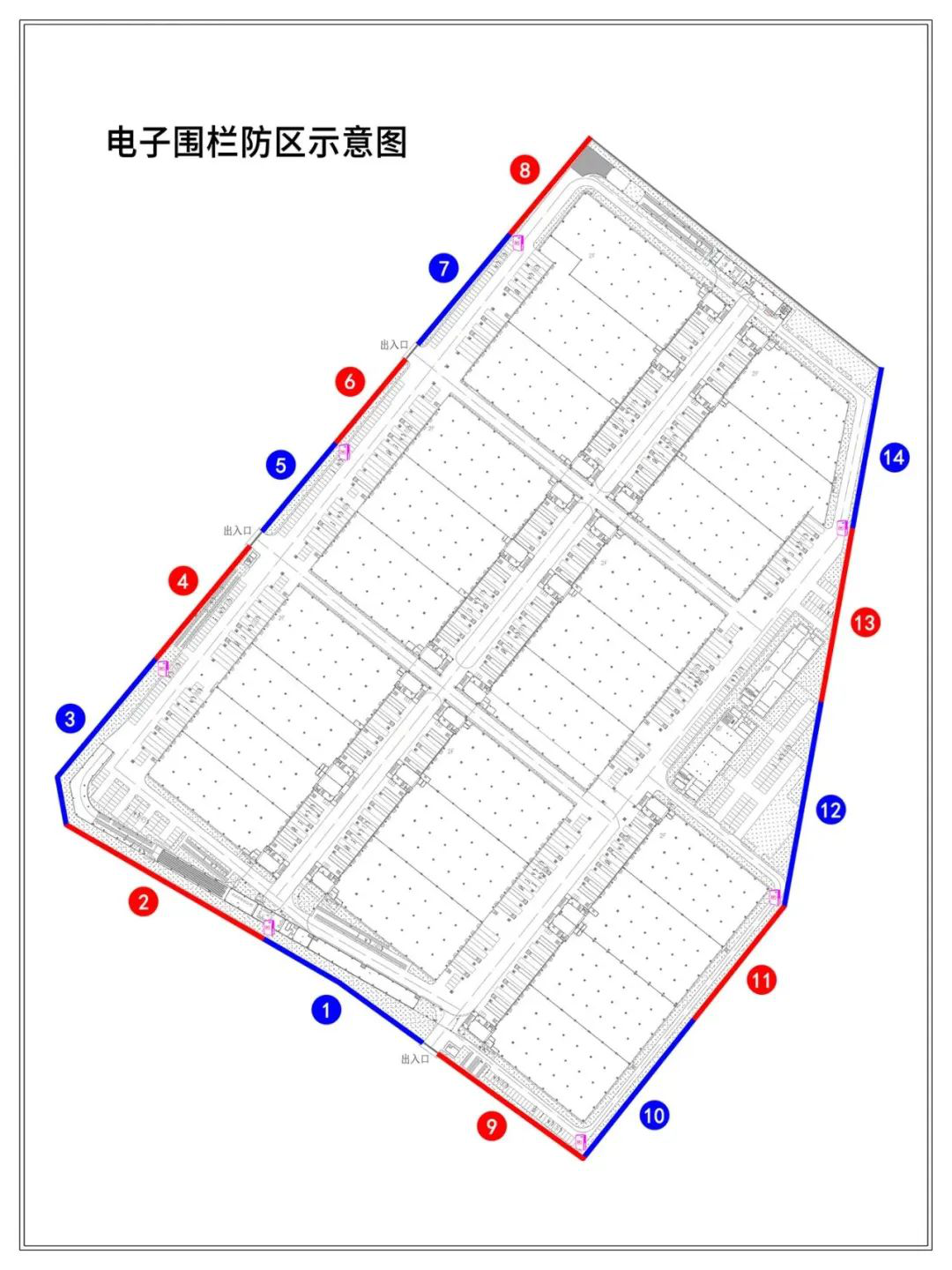 3、按照脈沖圍欄國家标準GB7946-2015規定單個防區不能超過100米,項目上我們設計爲14個防區。